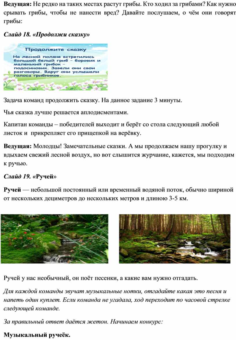 Ведущая: Молодцы! Замечательные сказки. А мы продолжаем нашу прогулку и вдыхаем свежий лесной воздух, но вот слышится журчание, кажется, мы подходим к ручью.