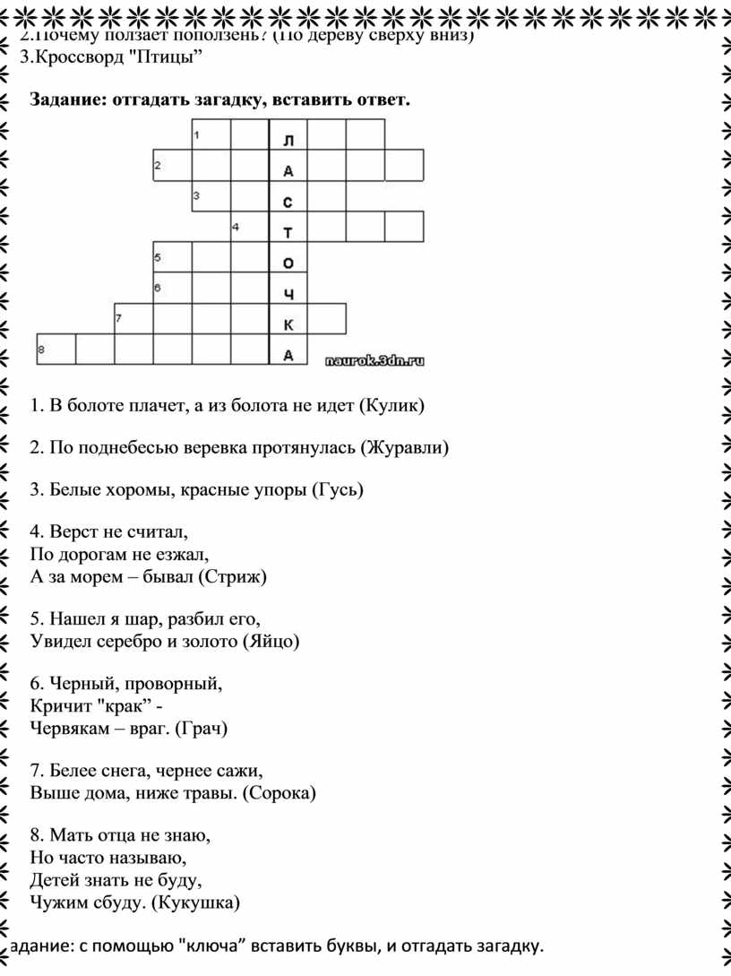 Задание: с помощью "ключа” вставить буквы, и отгадать загадку.