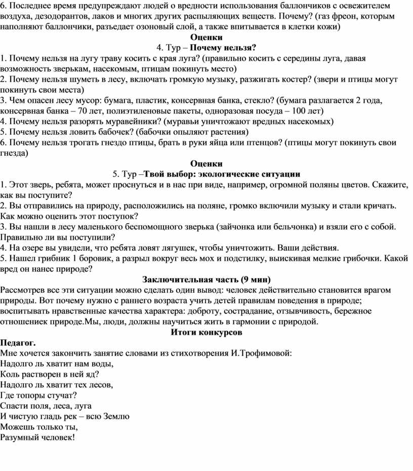 Рассмотрев все эти ситуации можно сделать один вывод: человек действительно становится врагом природы. Вот почему нужно с раннего возраста учить детей правилам поведения в природе; воспитывать нравственные качества характера: доброту, сострадание, отзывчивость, бережное отношениек природе.Мы, люди, должны научиться жить в гармонии с природой.