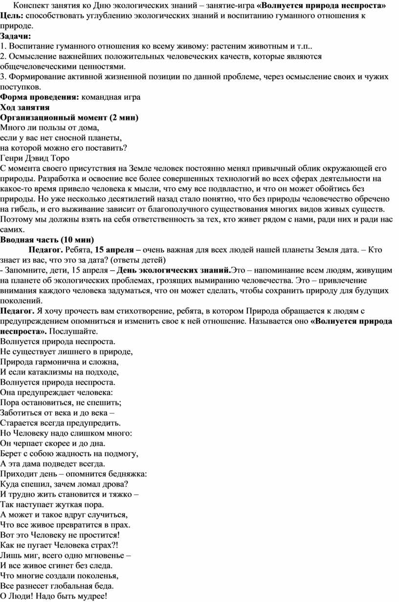 Конспект занятия ко Дню экологических знаний – занятие-игра «Волнуется природа неспроста»