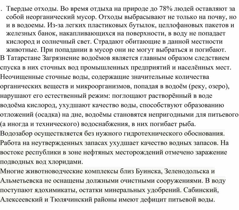 В Татарстане Загрязнение водоёмов является главным образом следствием спуска в них сточных вод промышленных предприятий и населённых мест. Неочищенные сточные воды, содержащие значительные количества органических веществ и микроорганизмов, попадая в водоём (реку, озеро), нарушают его естественный режим: поглощают растворённый в воде водоёма кислород, ухудшают качество воды, способствуют образованию отложений (осадка) на дне, водоёмы становятся непригодными для питьевого (а иногда и технического) водоснабжения, в них погибает рыба.