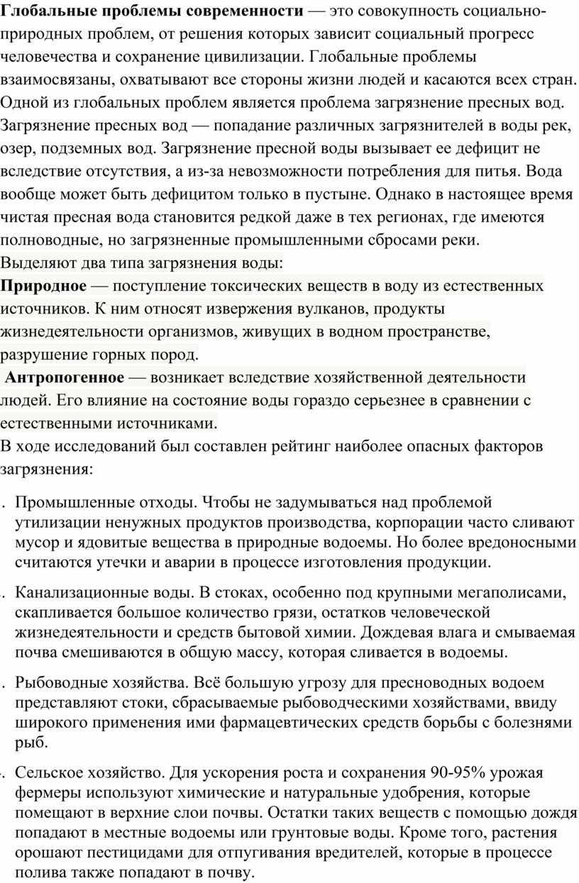 Одной из глобальных проблем является проблема загрязнение пресных вод.