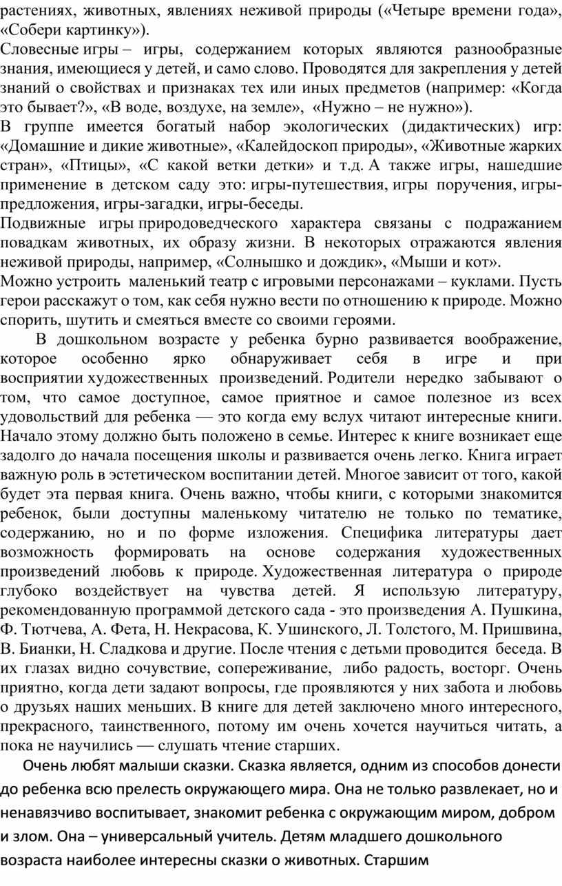 В дошкольном возрасте у ребенка бурно развивается воображение, которое особенно ярко обнаруживает себя в игре и при восприятии художественных произведений. Родители нередко забывают о том, что самое доступное, самое приятное и самое полезное из всех удовольствий для ребенка — это когда ему вслух читают интересные книги. Начало этому должно быть положено в семье. Интерес к книге возникает еще задолго до начала посещения школы и развивается очень легко. Книга играет важную роль в эстетическом воспитании детей. Многое зависит от того, какой будет эта первая книга. Очень важно, чтобы книги, с которыми знакомится ребенок, были доступны маленькому читателю не только по тематике, содержанию, но и по форме изложения. Специфика литературы дает возможность формировать на основе содержания художественных произведений любовь к природе. Художественная литература о природе глубоко воздействует на чувства детей. Я использую литературу, рекомендованную программой детского сада - это произведения А. Пушкина, Ф. Тютчева, А. Фета, Н. Некрасова, К. Ушинского, Л. Толстого, М. Пришвина, В. Бианки, Н. Сладкова и другие. После чтения с детьми проводится беседа. В их глазах видно сочувствие, сопереживание, либо радость, восторг. Очень приятно, когда дети задают вопросы, где проявляются у них забота и любовь о друзьях наших меньших. В книге для детей заключено много интересного, прекрасного, таинственного, потому им очень хочется научиться читать, а пока не научились — слушать чтение старших.