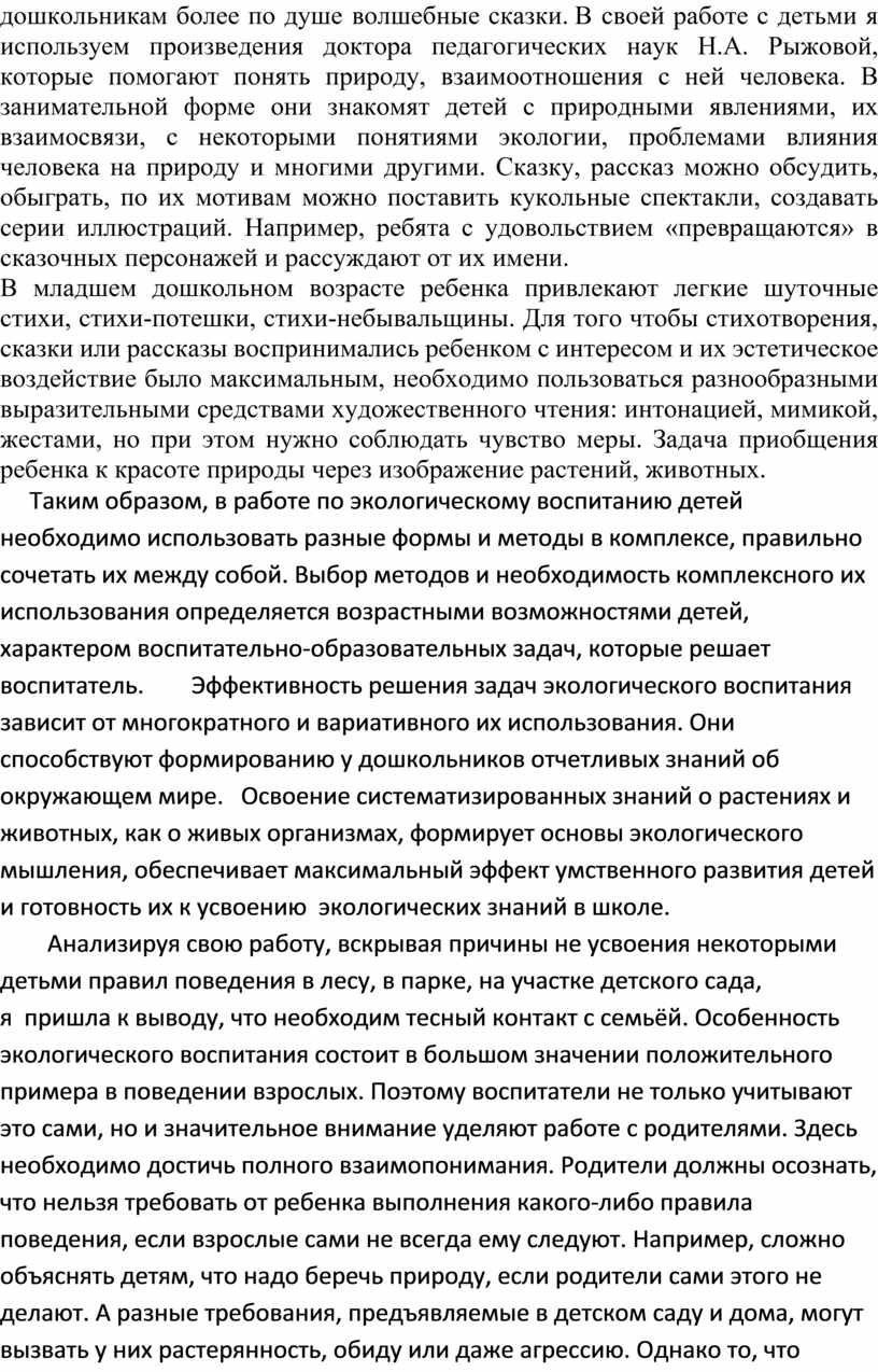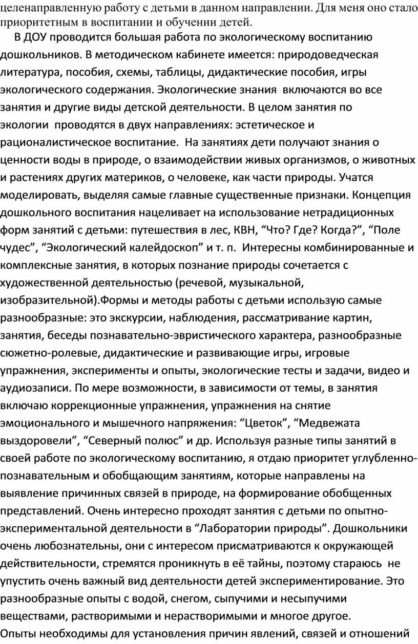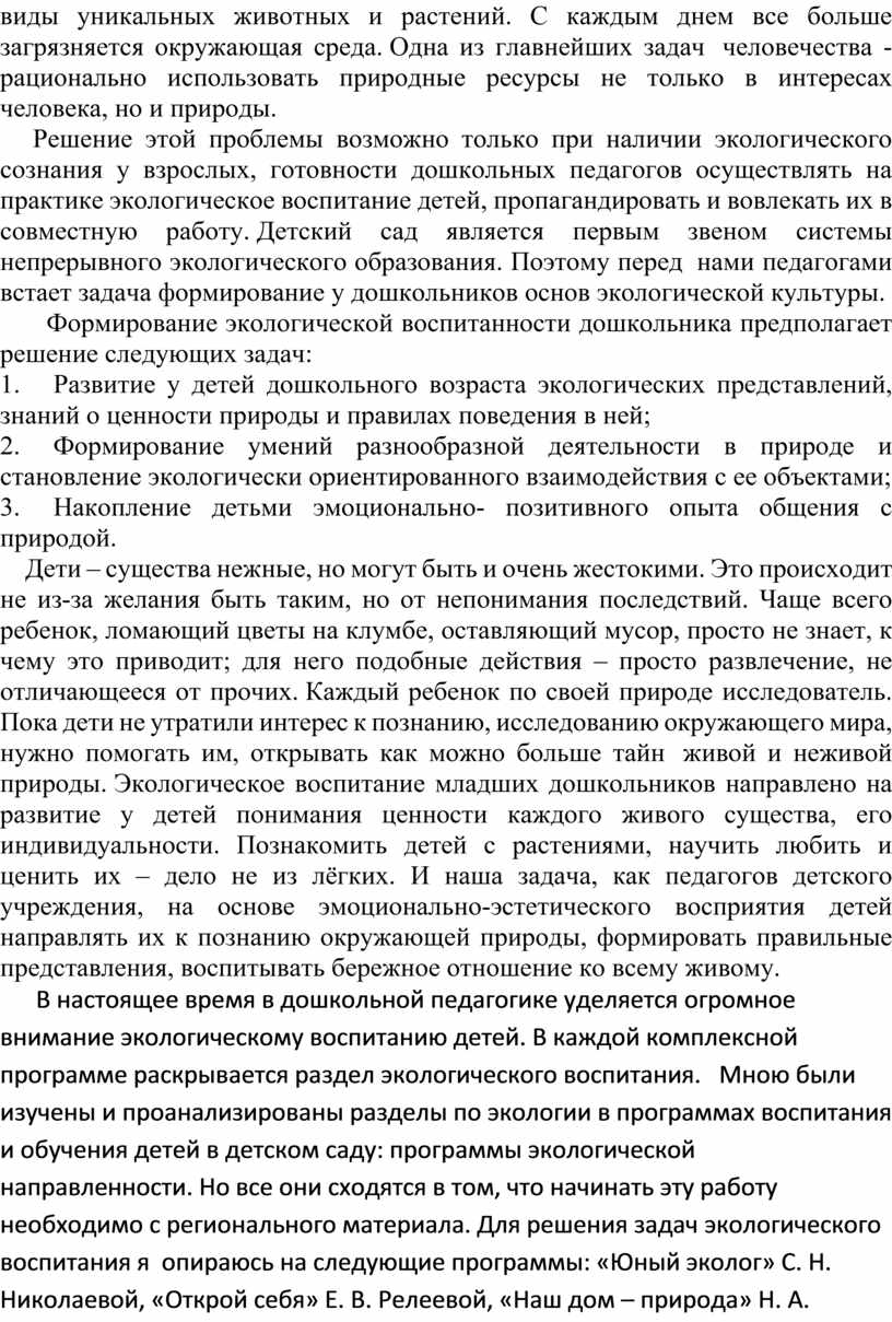 В настоящее время в дошкольной педагогике уделяется огромное внимание экологическому воспитанию детей. В каждой комплексной программе раскрывается раздел экологического воспитания. Мною были изучены и проанализированы разделы по экологии в программах воспитания и обучения детей в детском саду: программы экологической направленности. Но все они сходятся в том, что начинать эту работу необходимо с регионального материала. Для решения задач экологического воспитания я опираюсь на следующие программы: «Юный эколог» С. Н. Николаевой, «Открой себя» Е. В. Релеевой, «Наш дом – природа» Н. А. Рыжовой, Элементы этих программ я внедряю в свою работу. Понимание значимости экологических проблем все это позволяет проводить обширную целенаправленную работу с детьми в данном направлении. Для меня оно стало приоритетным в воспитании и обучении детей.