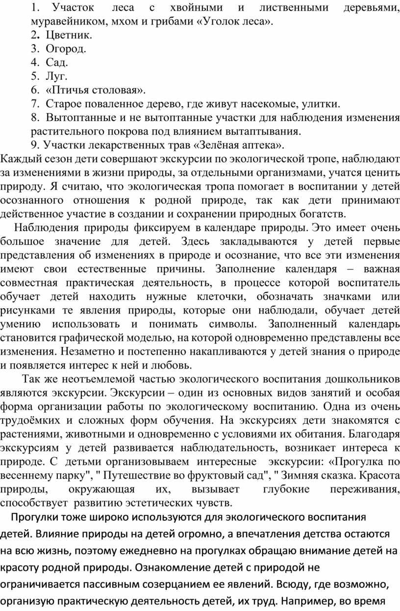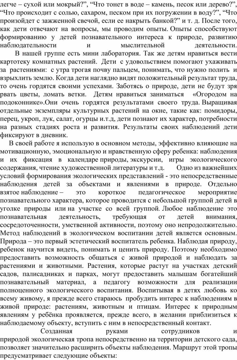 Каждый сезон дети совершают экскурсии по экологической тропе, наблюдают за изменениями в жизни природы, за отдельными организмами, учатся ценить природу. Я считаю, что экологическая тропа помогает в воспитании у детей осознанного отношения к родной природе, так как дети принимают действенное участие в создании и сохранении природных богатств.