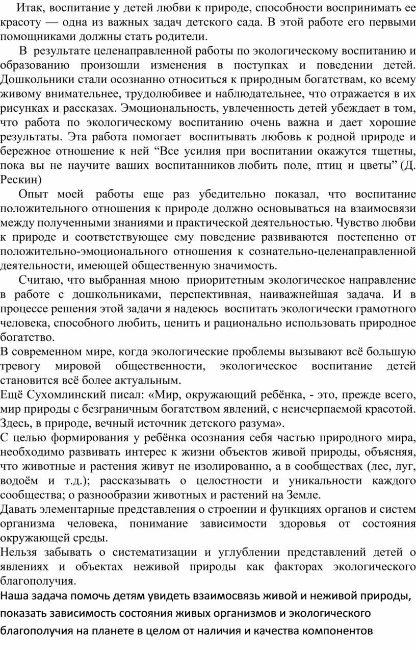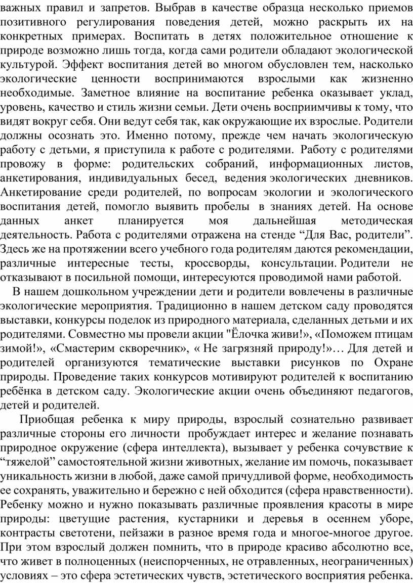В результате целенаправленной работы по экологическому воспитанию и образованию произошли изменения в поступках и поведении детей. Дошкольники стали осознанно относиться к природным богатствам, ко всему живому внимательнее, трудолюбивее и наблюдательнее, что отражается в их рисунках и рассказах. Эмоциональность, увлеченность детей убеждает в том, что работа по экологическому воспитанию очень важна и дает хорошие результаты. Эта работа помогает воспитывать любовь к родной природе и бережное отношение к ней “Все усилия при воспитании окажутся тщетны, пока вы не научите ваших воспитанников любить поле, птиц и цветы” (Д. Рескин)
