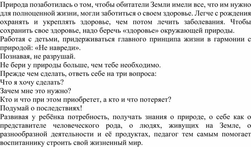Природа позаботилась о том, чтобы обитатели Земли имели все, что им нужно для полноценной жизни, могли заботиться о своем здоровье. Легче с рождения охранять и укреплять здоровье, чем потом лечить заболевания. Чтобы сохранить свое здоровье, надо беречь «здоровье» окружающей природы.