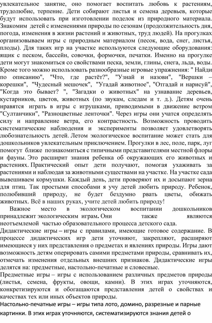 Прогулки тоже широко используются для экологического воспитания детей. Влияние природы на детей огромно, а впечатления детства остаются на всю жизнь, поэтому ежедневно на прогулках обращаю внимание детей на красоту родной природы. Ознакомление детей с природой не ограничивается пассивным созерцанием ее явлений. Всюду, где возможно, организую практическую деятельность детей, их труд. Например, во время наблюдения в цветнике, дети берут с собой коробочки для сбора семян. Сбор семян – увлекательное занятие, оно помогает воспитать любовь к растениям, трудолюбие, терпение. Дети собирают листья и семена деревьев, которые будут использовать при изготовлении поделок из природного материала. Знакомим детей с изменениями природы по сезонам (продолжительность дня, погода, изменения в жизни растений и животных, труд людей). На прогулках организовываем игры с природным материалом (песок, вода, снег, листья, плоды). Для таких игр на участке используются следующие оборудования: ящик с песком, бассейн, совочки, формочки, печатки. Именно на прогулке дети могут знакомиться со свойствами песка, земли, глины, снега, льда, воды. Кроме того можно использовать разнообразные игровые упражнения: " Найди по описанию", "Что, где растёт?", "Узнай и назови", "Вершки – корешки", "Чудесный мешочек", "Угадай животное", "Отгадай и нарисуй", "Когда это бывает? ", "Загадки о животных" на узнавание деревьев, кустарников, цветов, животных (по звукам, следам и т. д.). Детям очень нравятся играть в игры с игрушками, приводимыми в движение ветром "Султанчики", "Разноцветные ленточки". Через игры они учатся определять силу и направление ветра, его контрастность. Возможность проводить систематические наблюдения и эксперименты позволяет удовлетворять любознательность детей. Летом экологическое воспитание может стать для дошкольников увлекательным приключением. Прогулки в лес, поле, парк, луг помогут ближе познакомиться с типичными представителями местной флоры и фауны. Это расширит знания ребенка об окружающих его животных и растениях. Практический опыт дети получают, помогая ухаживать за растениями и наблюдая за животными существами на участке. На участке сада вывешиваем кормушки. Каждый день, дети проверяют их и досыпают зерна для птиц. Так простыми способами я учу детей любить природу. Ребенок, полюбивший природу, не будет бездумно рвать цветы, обижать животных. Всё в наших руках, учите детей любить природу!