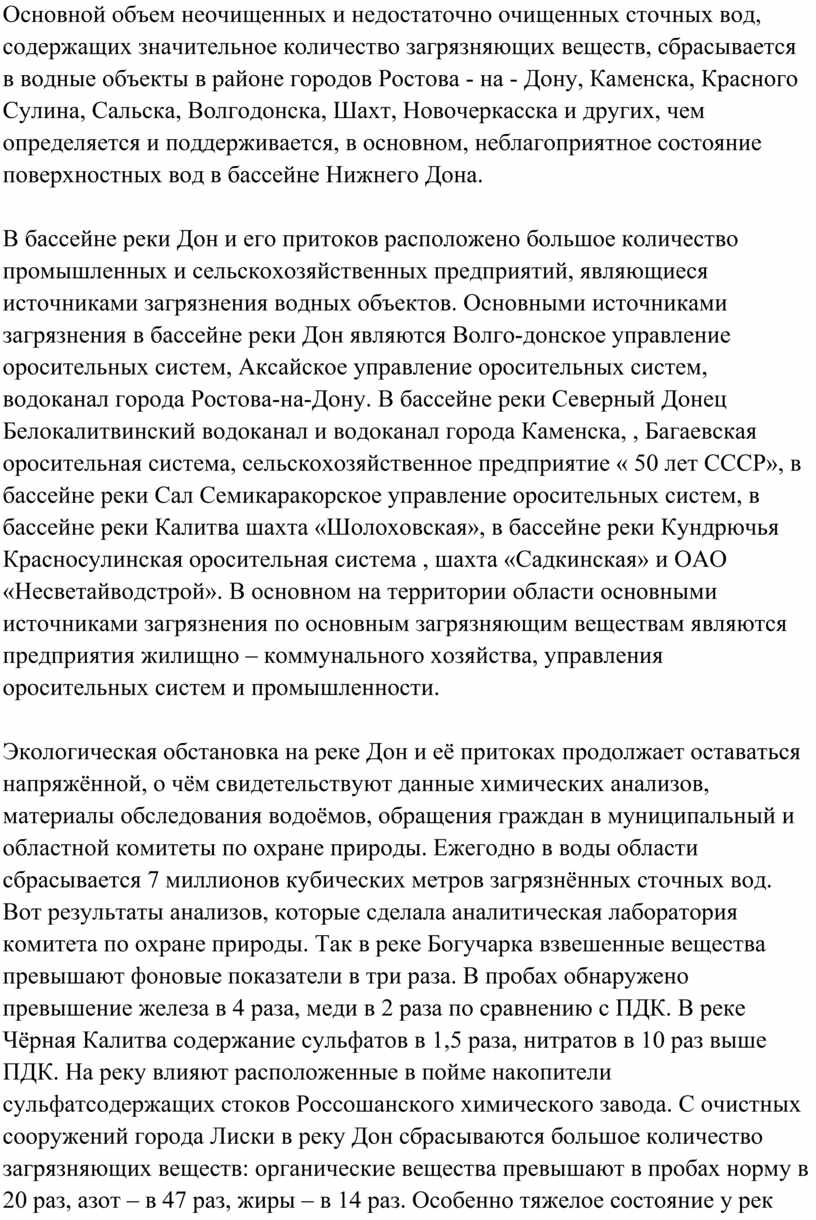Основной объем неочищенных и недостаточно очищенных сточных вод, содержащих значительное количество загрязняющих веществ, сбрасывается в водные объекты в районе городов Ростова - на - Дону, Каменска, Красного Сулина, Сальска, Волгодонска, Шахт, Новочеркасска и других, чем определяется и поддерживается, в основном, неблагоприятное состояние поверхностных вод в бассейне Нижнего Дона.