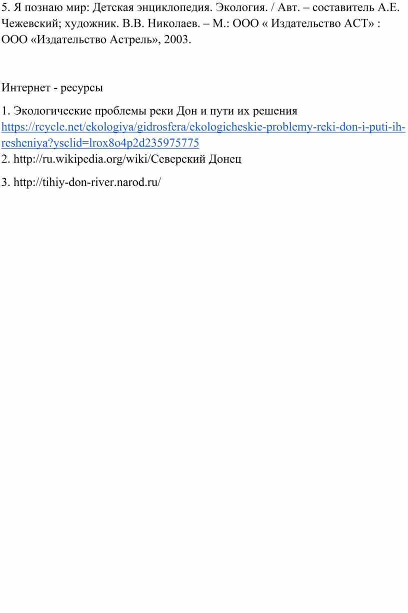 5. Я познаю мир: Детская энциклопедия. Экология. / Авт. – составитель А.Е. Чежевский; художник. В.В. Николаев. – М.: ООО « Издательство АСТ» : ООО «Издательство Астрель», 2003.