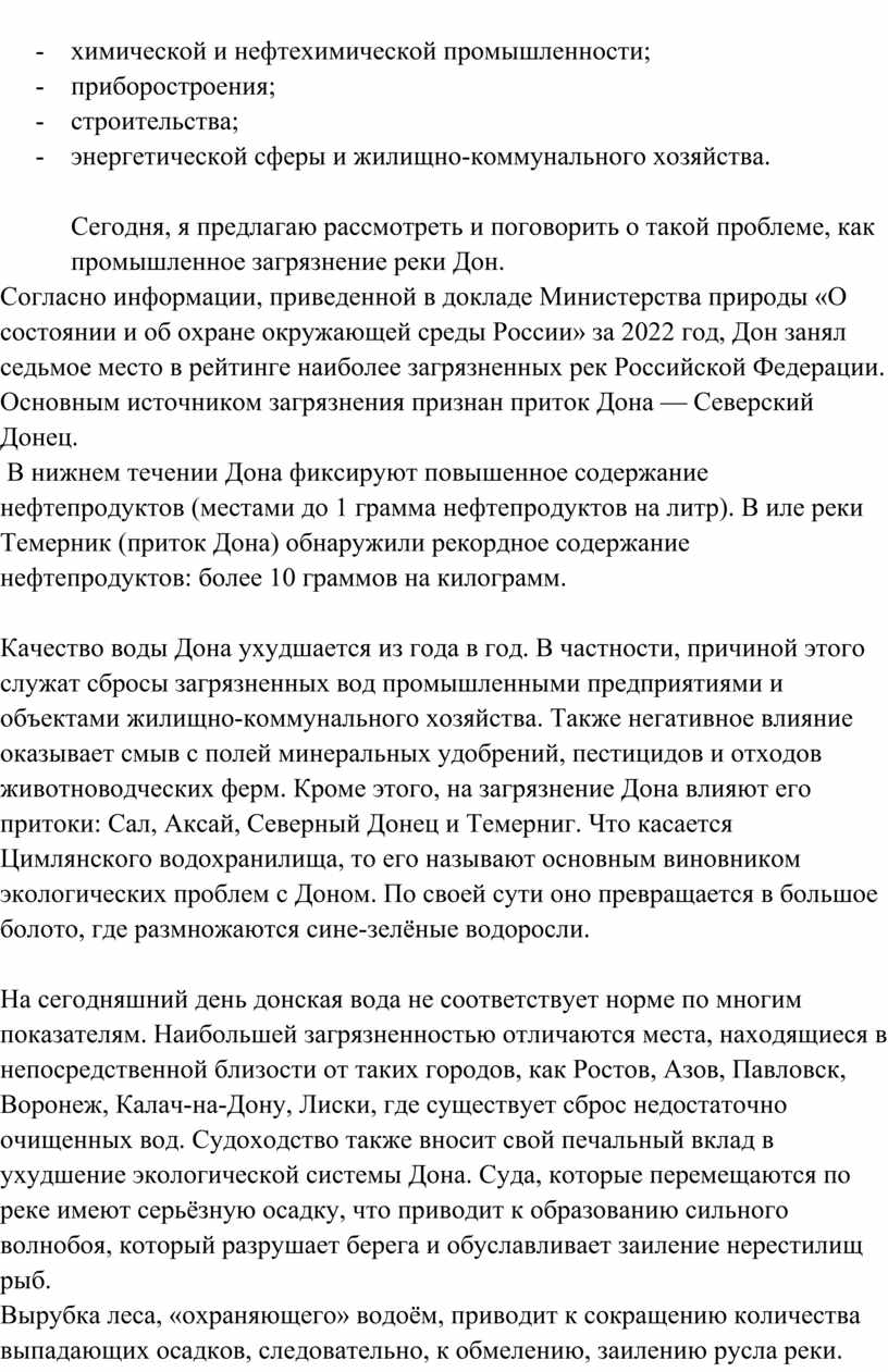 3 Описать влияния промышленности на чистоту воду реки Дон