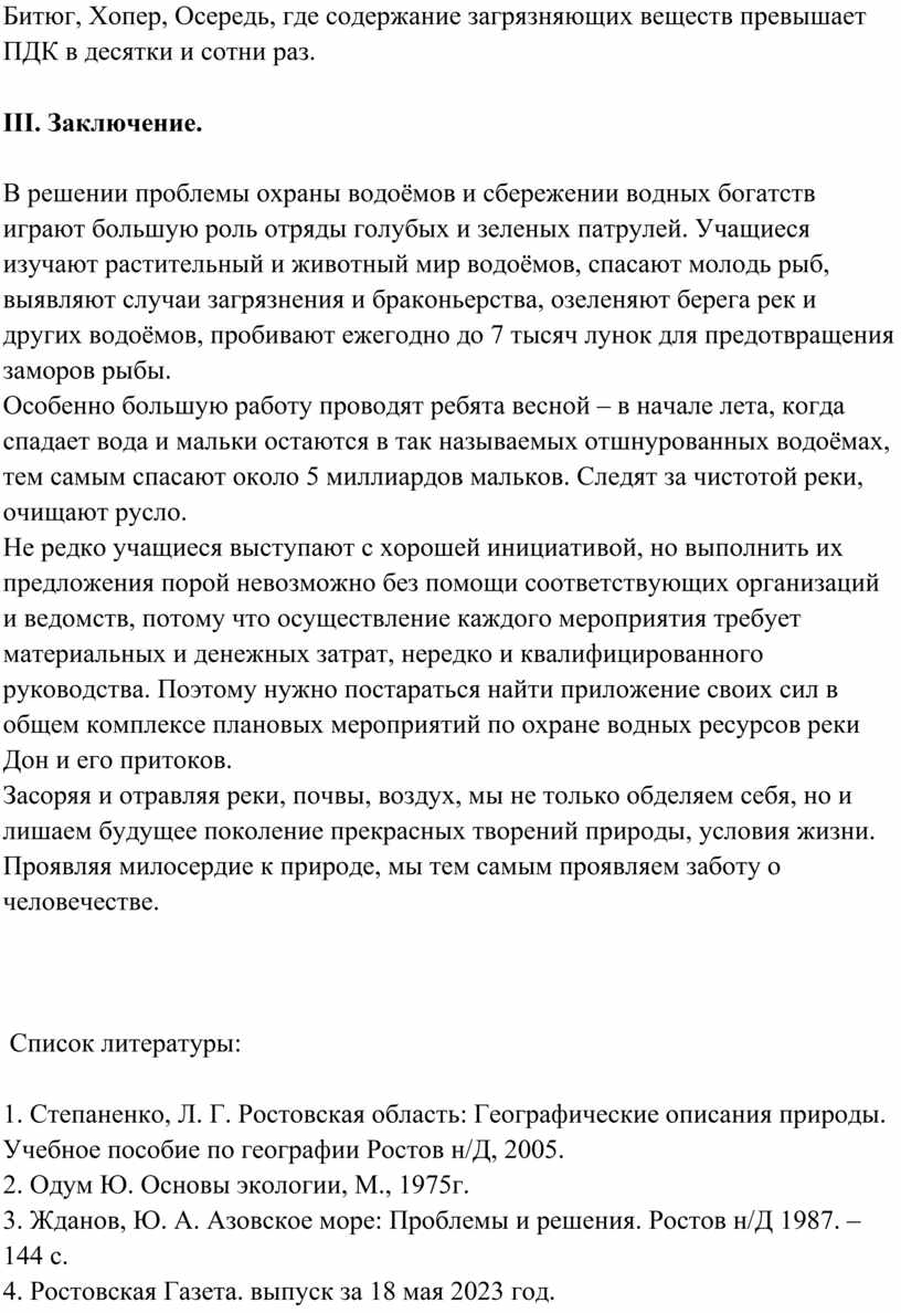 Не редко учащиеся выступают с хорошей инициативой, но выполнить их предложения порой невозможно без помощи соответствующих организаций и ведомств, потому что осуществление каждого мероприятия требует материальных и денежных затрат, нередко и квалифицированного руководства. Поэтому нужно постараться найти приложение своих сил в общем комплексе плановых мероприятий по охране водных ресурсов реки Дон и его притоков.