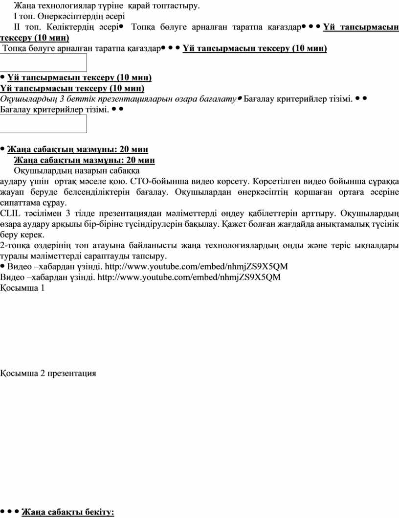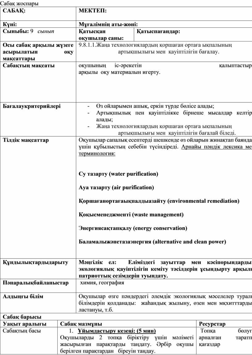 Жаңа сабақтың мазмұны: 20 мин Оқушылардың назарын сабаққа аудару үшін ортақ мәселе қою. СТО-бойынша видео көрсету. Көрсетілген видео бойынша сұраққа жауап беруде белсенділіктерін бағалау. Оқушылардан өнеркәсіптің қоршаған ортаға әсеріне сипаттама сұрау. CLIL тәсілімен 3 тілде презентациядан мәліметтерді өңдеу қабілеттерін арттыру. Оқушылардың өзара аудару арқылы бір-біріне түсіндірулерін бақылау. Қажет болған жағдайда анықтамалық түсінік беру керек. 2-топқа өздерінің топ атауына байланысты жаңа технологиялардың оңды және теріс ықпалдары туралы мәліметтерді сараптауды тапсыру.