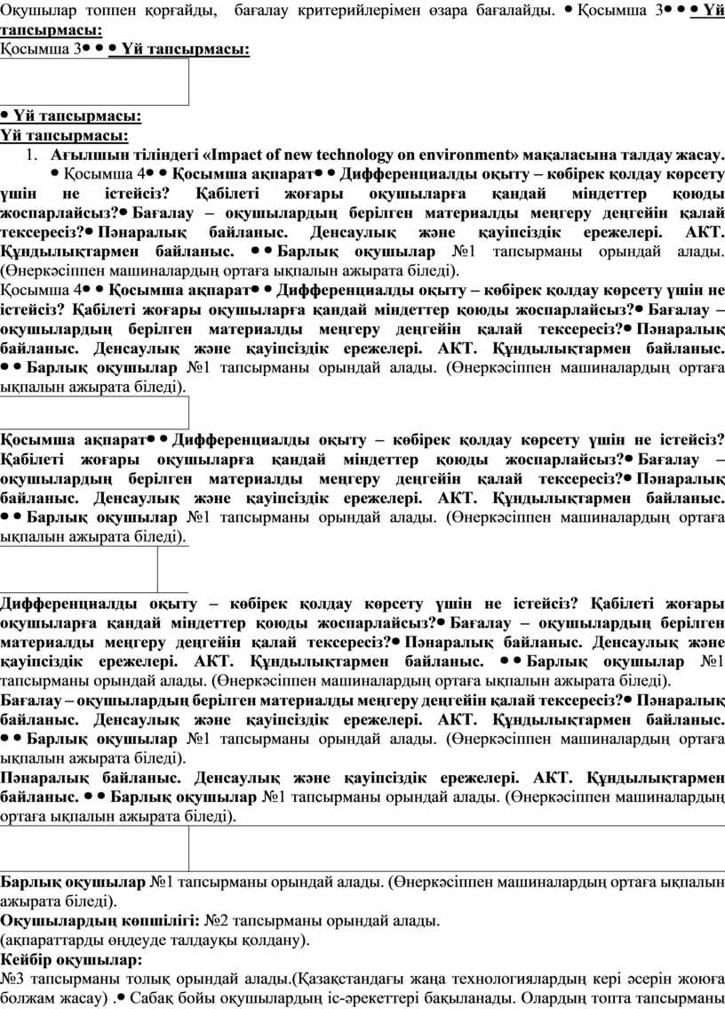 Барлық оқушылар №1 тапсырманы орындай алады. (Өнеркәсіппен машиналардың ортаға ықпалын ажырата біледі). Оқушылардың көпшілігі: №2 тапсырманы орындай алады. (ақпараттарды өңдеуде талдауқы қолдану). Кейбір оқушылар: №3 тапсырманы толық орындай алады.(Қазақстандағы жаңа технологиялардың кері әсерін жоюға болжам жасау) . |