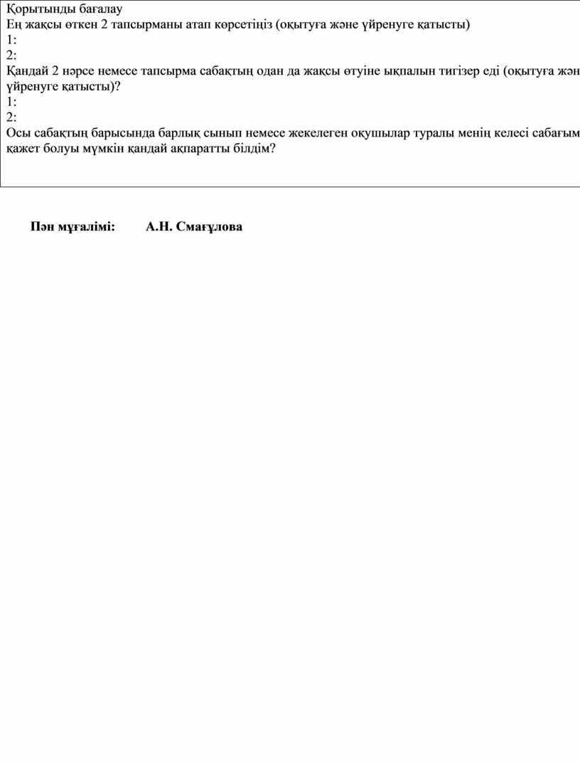 Қорытынды бағалау Ең жақсы өткен 2 тапсырманы атап көрсетіңіз (оқытуға және үйренуге қатысты) 1: 2: Қандай 2 нәрсе немесе тапсырма сабақтың одан да жақсы өтуіне ықпалын тигізер еді (оқытуға және үйренуге қатысты)? 1: 2: Осы сабақтың барысында барлық сынып немесе жекелеген оқушылар туралы менің келесі сабағыма қажет болуы мүмкін қандай ақпаратты білдім?