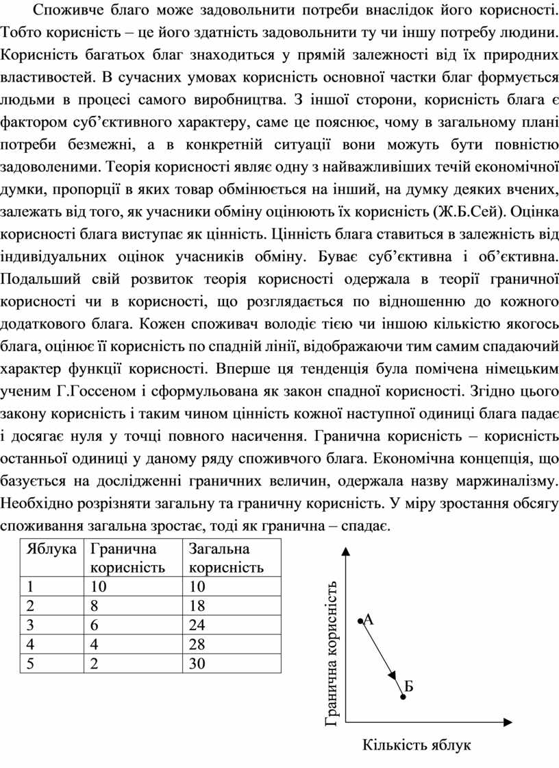 Споживче благо може задовольнити потреби внаслідок його корисності. Тобто корисність – це його здатність задовольнити ту чи іншу потребу людини. Корисність багатьох благ знаходиться у прямій залежності від їх природних властивостей. В сучасних умовах корисність основної частки благ формується людьми в процесі самого виробництва. З іншої сторони, корисність блага є фактором суб’єктивного характеру, саме це пояснює, чому в загальному плані потреби безмежні, а в конкретній ситуації вони можуть бути повністю задоволеними. Теорія корисності являє одну з найважливіших течій економічної думки, пропорції в яких товар обмінюється на інший, на думку деяких вчених, залежать від того, як учасники обміну оцінюють їх корисність (Ж.Б.Сей). Оцінка корисності блага виступає як цінність. Цінність блага ставиться в залежність від індивідуальних оцінок учасників обміну. Буває суб’єктивна і об’єктивна. Подальший свій розвиток теорія корисності одержала в теорії граничної корисності чи в корисності, що розглядається по відношенню до кожного додаткового блага. Кожен споживач володіє тією чи іншою кількістю якогось блага, оцінює її корисність по спадній лінії, відображаючи тим самим спадаючий характер функції корисності. Вперше ця тенденція була помічена німецьким ученим Г.Госсеном і сформульована як закон спадної корисності. Згідно цього закону корисність і таким чином цінність кожної наступної одиниці блага падає і досягає нуля у точці повного насичення. Гранична корисність – корисність останньої одиниці у даному ряду споживчого блага. Економічна концепція, що базується на дослідженні граничних величин, одержала назву маржиналізму. Необхідно розрізняти загальну та граничну корисність. У міру зростання обсягу споживання загальна зростає, тоді як гранична – спадає.