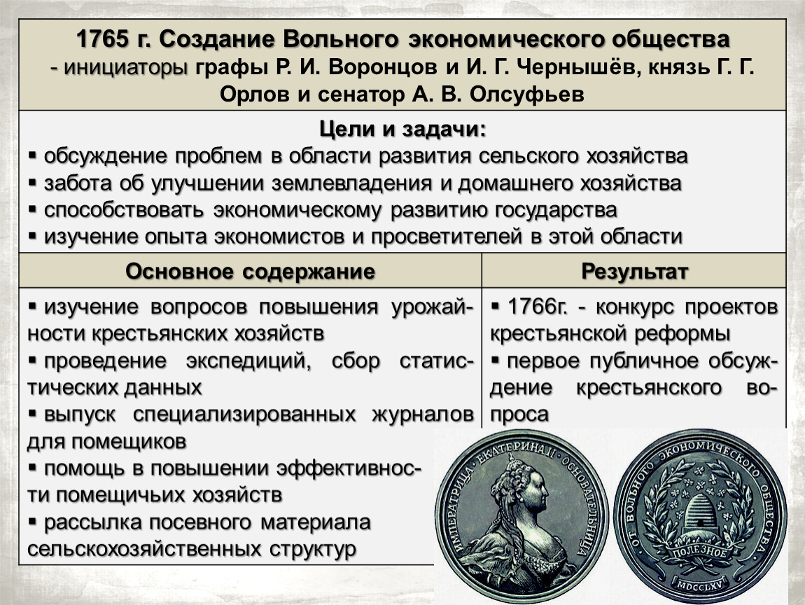 изучение вопросов повышения урожай-ности крестьянских хозяйств | 1766г. - конкурс проектов крестьянской реформы |