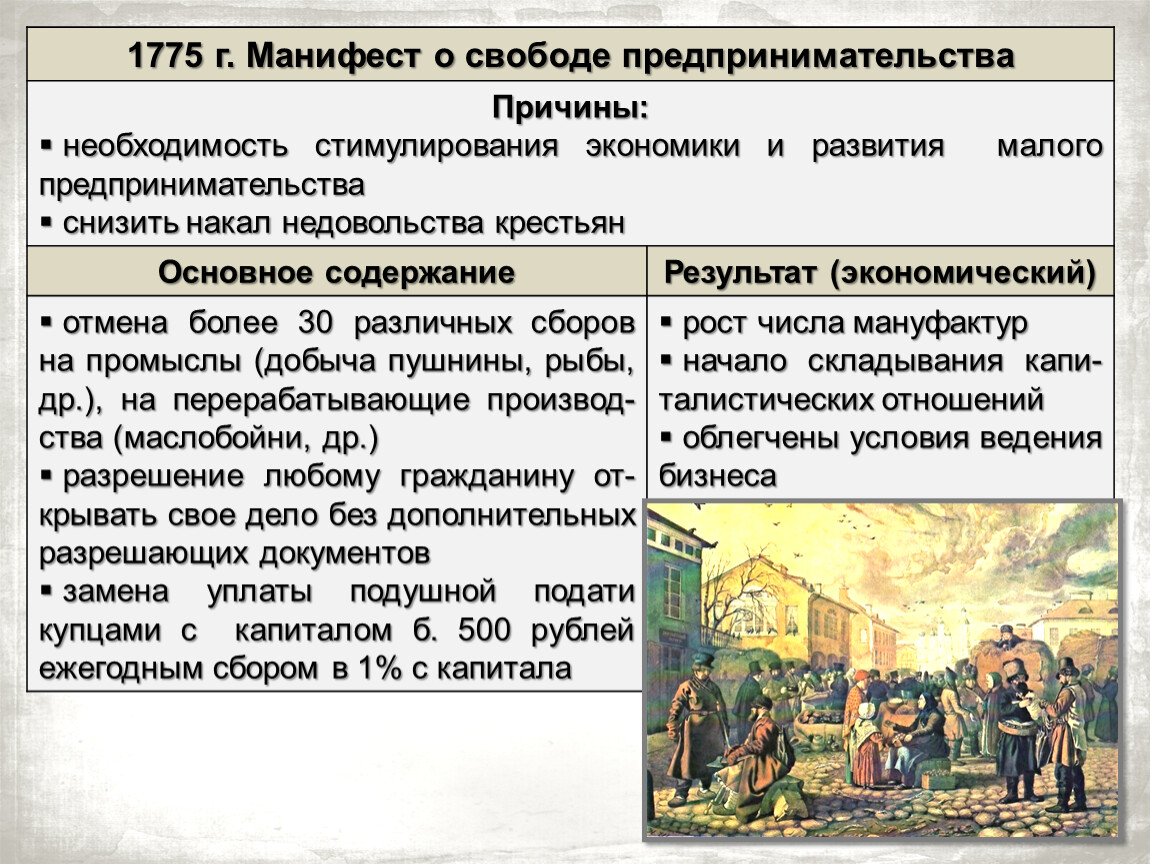1775 г. Манифест о свободе предпринимательства | |