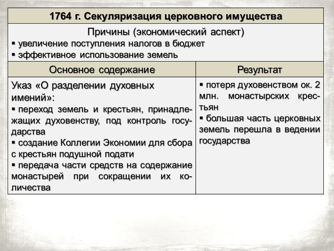 Указ «О разделении духовных имений»: | потеря духовенством ок. 2 млн. монастырских крес-тьян |