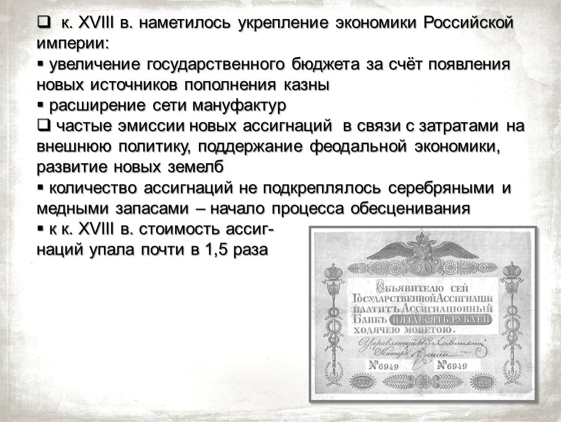 частые эмиссии новых ассигнаций в связи с затратами на внешнюю политику, поддержание феодальной экономики, развитие новых земелб