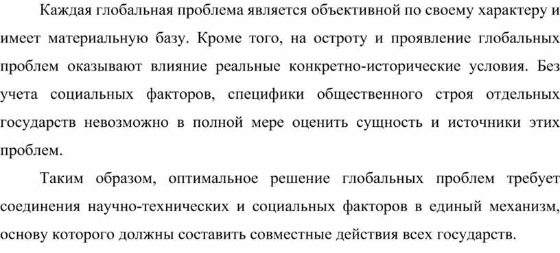 Таким образом, оптимальное решение глобальных проблем требует соединения научно-технических и социальных факторов в единый механизм, основу которого должны составить совместные действия всех государств.