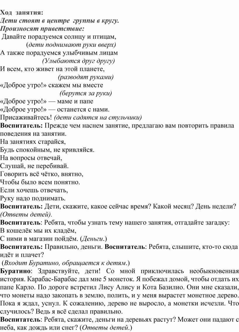Буратино: Здравствуйте, дети! Со мной приключилась необыкновенная история. Карабас-Барабас дал мне 5 монеток. Я побежал домой, чтобы отдать их папе Карло. По дороге встретил Лису Алису и Кота Базилио. Они мне сказали, что монеты надо закопать в землю, полить, и у меня вырастет монетное дерево. Пока я ждал, уснул. К сожалению, дерево не выросло, а монетки исчезли. Что случилось? Ведь я всё сделал правильно.