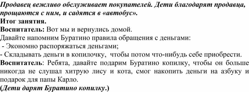 Воспитатель: Ребята, давайте подарим Буратино копилку, чтобы он больше никогда не слушал хитрую лису и кота, смог накопить деньги на азбуку и подарок для папы Карло.