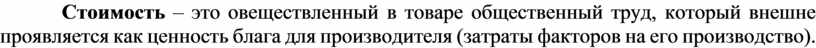 Стоимость – это овеществленный в товаре общественный труд, который внешне проявляется как ценность блага для производителя (затраты факторов на его производство).