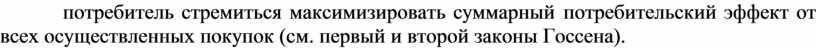 Принцип убывающей предельной полезности: чем интенсивнее потребление благ, тем меньше увеличение полезности, получаемой от каждой дополнительно потреблённой единицы блага. Закон убывающей предельной полезности гласит, что по мере роста количества потребляемого блага общая полезность от потребления возрастает, но всё в меньшей пропорции, а предельная полезность – будет сокращаться. Правило потребительского поведения: при убывающей предельной полезности любого товара потребитель стремиться максимизировать суммарный потребительский эффект от всех осуществленных покупок (см. первый и второй законы Госсена).
