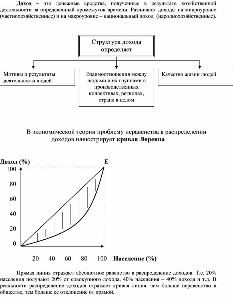 Прямая линия отражает абсолютное равенство в распределение доходов. Т.е. 20% населения получают 20% от совокупного дохода, 40% населения – 40% дохода и т.д. В реальности распределение доходов отражает кривая линия, чем больше неравенство в обществе, тем больше ее отклонение от прямой.