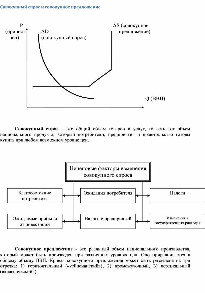 Совокупное предложение - это реальный объем национального производства, который может быть произведен при различных уровнях цен. Оно приравнивается к общему объему ВВП. Кривая совокупного предложения может быть разделена на три отрезка: 1) горизонтальный («кейнсианский»), 2) промежуточный, 3) вертикальный («классический»).