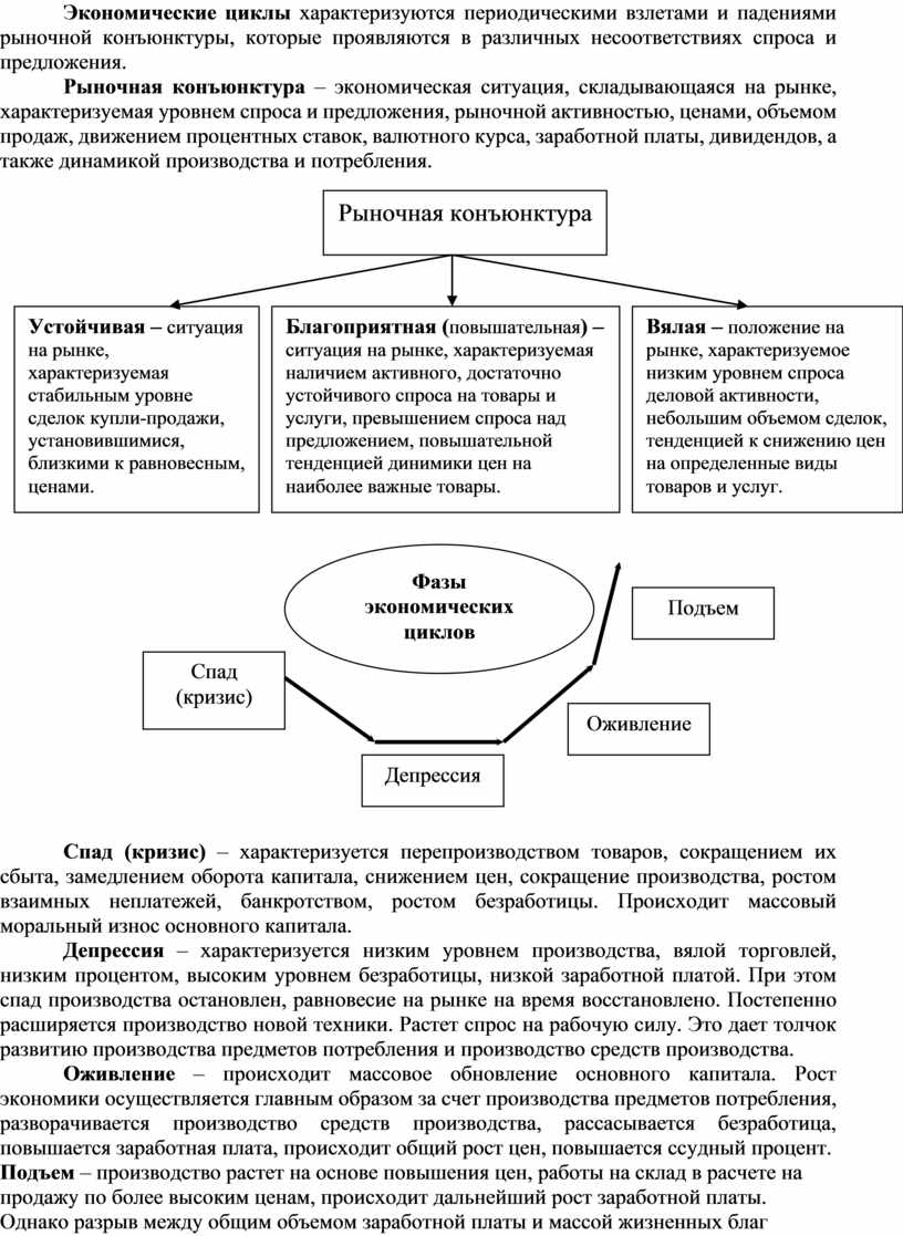 Экономические циклы характеризуются периодическими взлетами и падениями рыночной конъюнктуры, которые проявляются в различных несоответствиях спроса и предложения.