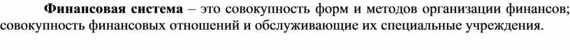 Финансовая система – это совокупность форм и методов организации финансов; совокупность финансовых отношений и обслуживающие их специальные учреждения.