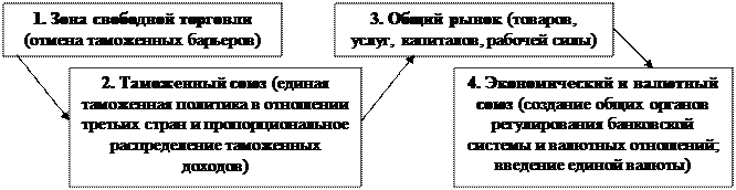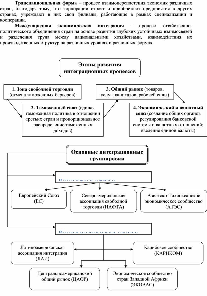 Международная экономическая интеграция – процесс хозяйственно-политического объединения стран на основе развития глубоких устойчивых взаимосвязей и разделения труда между национальными хозяйствами, взаимодействия их производственных структур на различных уровнях и различных формах.