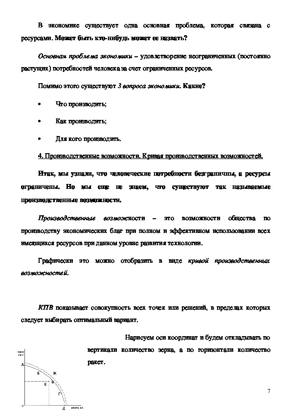 познакомить учащихся с производственными возможностями, объяснить, что показывает кривая производственных возможностей.