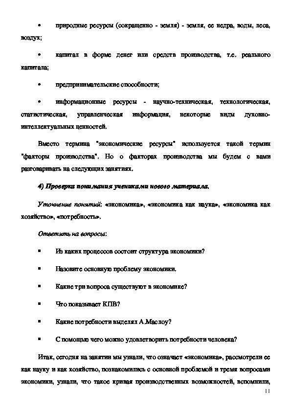 систематизировать знания о потребностях и ресурсах, существующих в экономике;