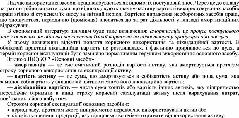 У цьому визначенні відсутні поняття корисного використання та ліквідаційної вартості. В обліковій практиці ліквідаційна вартість не розглядалася, і фактично прирівнюється до нуля, а термін корисної експлуатації було замінено нормативним терміном використання основного засобу.