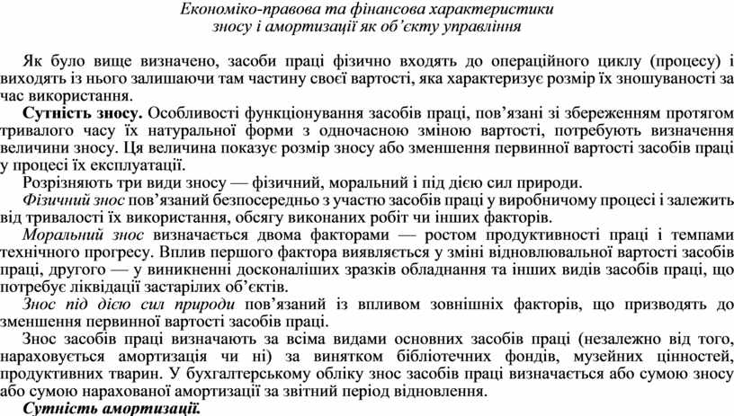 Сутність зносу. Особливості функціонування засобів праці, пов’язані зі збереженням протягом тривалого часу їх натуральної форми з одночасною зміною вартості, потребують визначення величини зносу. Ця величина показує розмір зносу або зменшення первинної вартості засобів праці у процесі їх експлуатації.