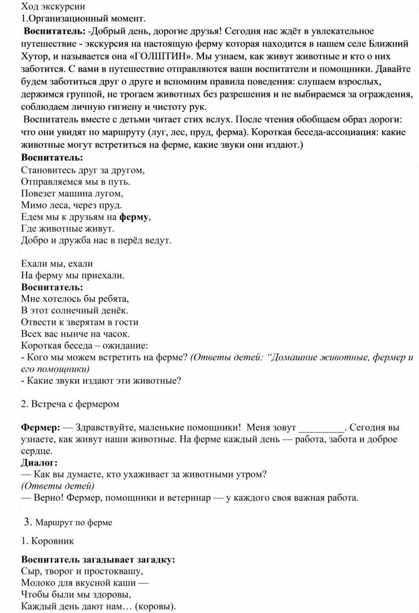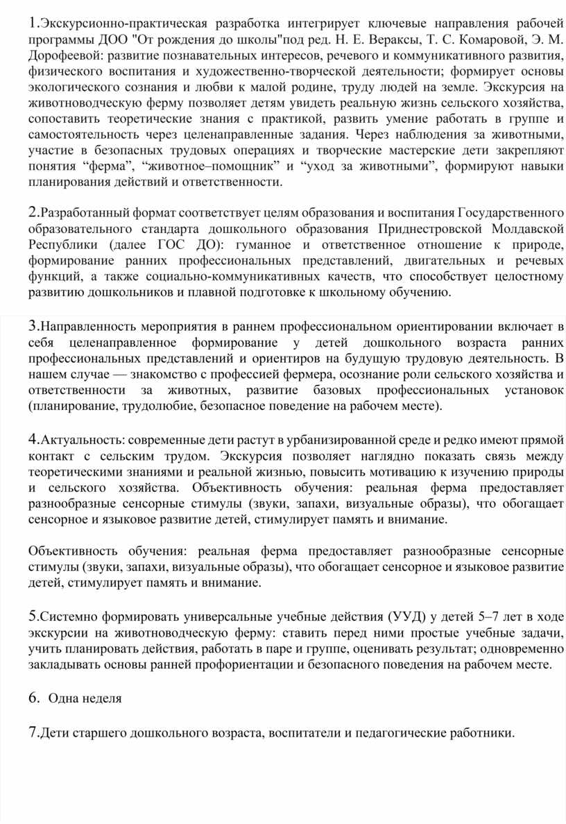 1.Экскурсионно-практическая разработка интегрирует ключевые направления рабочей программы ДОО "От рождения до школы"под ред. Н. Е. Вераксы, Т. С. Комаровой, Э. М. Дорофеевой: развитие познавательных интересов, речевого и коммуникативного развития, физического воспитания и художественно-творческой деятельности; формирует основы экологического сознания и любви к малой родине, труду людей на земле. Экскурсия на животноводческую ферму позволяет детям увидеть реальную жизнь сельского хозяйства, сопоставить теоретические знания с практикой, развить умение работать в группе и самостоятельность через целенаправленные задания. Через наблюдения за животными, участие в безопасных трудовых операциях и творческие мастерские дети закрепляют понятия “ферма”, “животное–помощник” и “уход за животными”, формируют навыки планирования действий и ответственности.