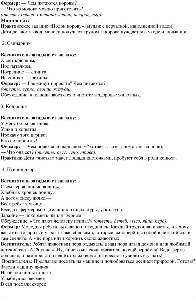 Фермер: — Здравствуйте, маленькие помощники! Меня зовут _________. Сегодня вы узнаете, как живут наши животные. На ферме каждый день — работа, забота и доброе сердце.