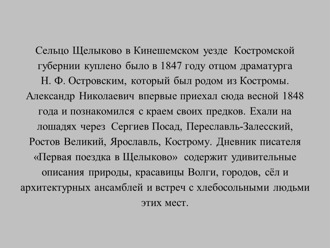 Сельцо Щелыково в Кинешемском уезде Костромской губернии куплено было в 1847 году отцом драматурга Н. Ф. Островским, который был родом из Костромы. Александр Николаевич впервые приехал сюда весной 1848 года и познакомился с краем своих предков. Ехали на лошадях через Сергиев Посад, Переславль-Залесский, Ростов Великий, Ярославль, Кострому. Дневник писателя «Первая поездка в Щелыково» содержит удивительные описания природы, красавицы Волги, городов, сёл и архитектурных ансамблей и встреч с хлебосольными людьми этих мест.