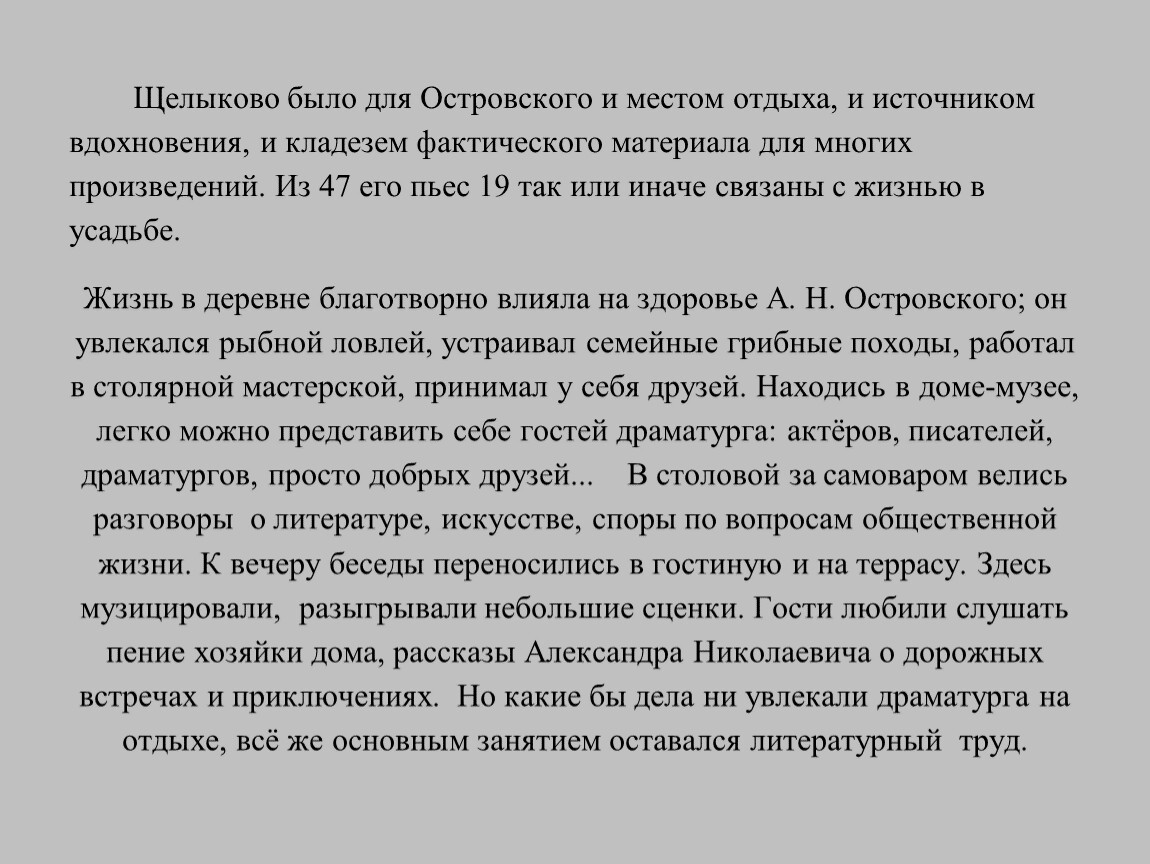 Щелыково было для Островского и местом отдыха, и источником вдохновения, и кладезем фактического материала для многих произведений. Из 47 его пьес 19 так или иначе связаны с жизнью в усадьбе.