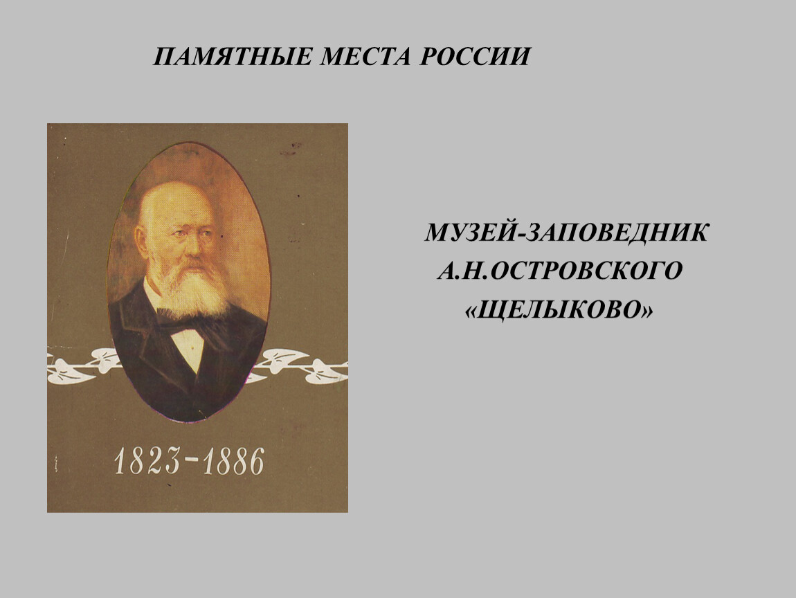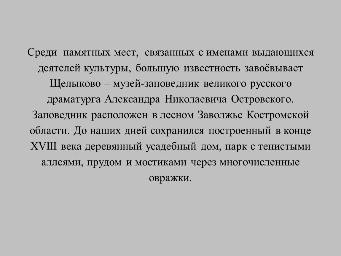Среди памятных мест, связанных с именами выдающихся деятелей культуры, большую известность завоёвывает Щелыково – музей-заповедник великого русского драматурга Александра Николаевича Островского. Заповедник расположен в лесном Заволжье Костромской области. До наших дней сохранился построенный в конце XVIII века деревянный усадебный дом, парк с тенистыми аллеями, прудом и мостиками через многочисленные овражки.