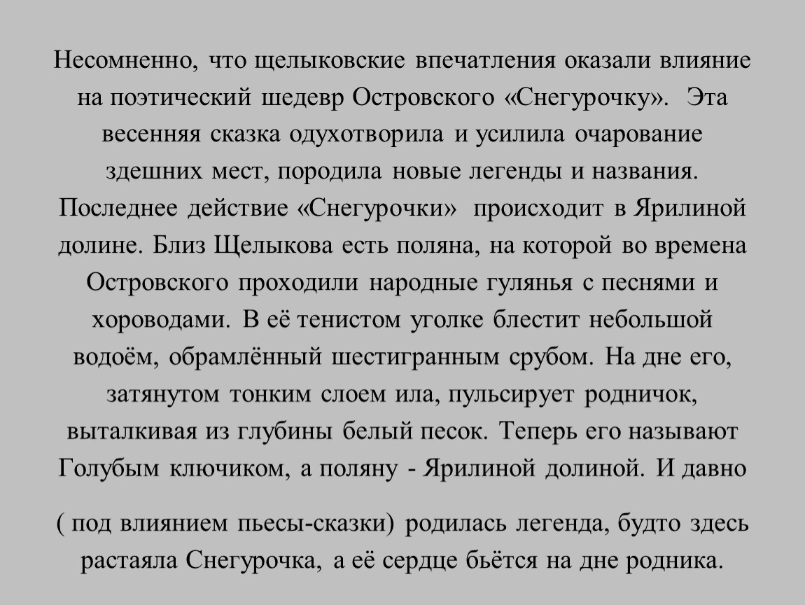 Несомненно, что щелыковские впечатления оказали влияние на поэтический шедевр Островского «Снегурочку». Эта весенняя сказка одухотворила и усилила очарование здешних мест, породила новые легенды и названия. Последнее действие «Снегурочки» происходит в Ярилиной долине. Близ Щелыкова есть поляна, на которой во времена Островского проходили народные гулянья с песнями и хороводами. В её тенистом уголке блестит небольшой водоём, обрамлённый шестигранным срубом. На дне его, затянутом тонким слоем ила, пульсирует родничок, выталкивая из глубины белый песок. Теперь его называют Голубым ключиком, а поляну - Ярилиной долиной. И давно
