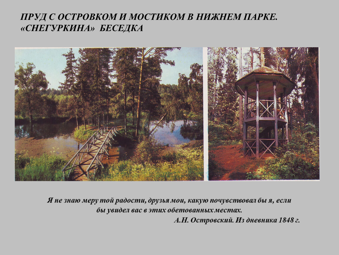 ПРУД С ОСТРОВКОМ И МОСТИКОМ В НИЖНЕМ ПАРКЕ. «СНЕГУРКИНА» БЕСЕДКА