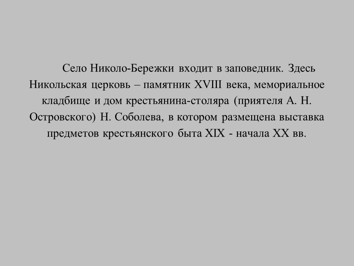Село Николо-Бережки входит в заповедник. Здесь Никольская церковь – памятник ХVIII века, мемориальное кладбище и дом крестьянина-столяра (приятеля А. Н. Островского) Н. Соболева, в котором размещена выставка предметов крестьянского быта ХIХ - начала ХХ вв.