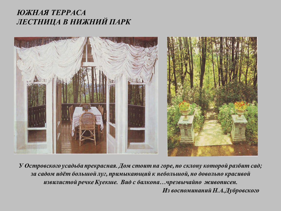 У Островского усадьба прекрасная. Дом стоит на горе, по склону которой разбит сад;