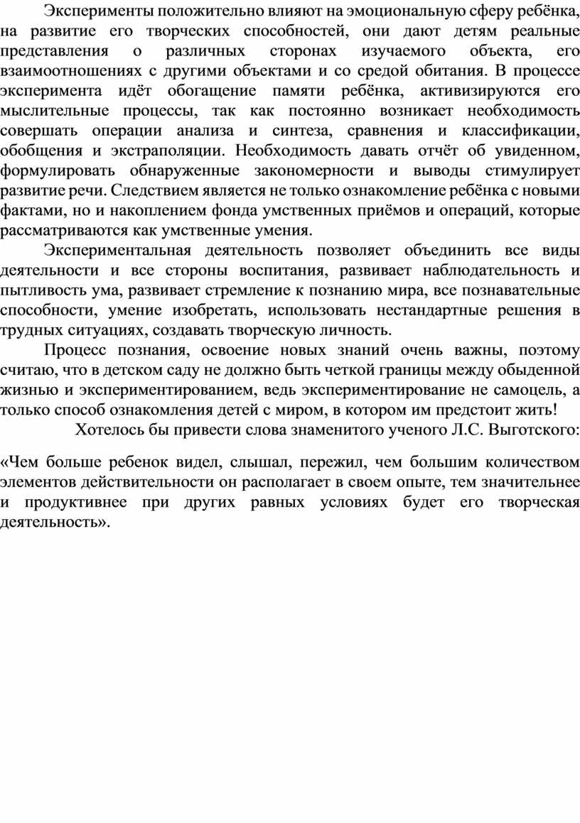Из приведенных высказываний видно, что экспериментирование всегда считалось эффективным способом обучения детей. Настало время для широкого внедрения этого метода в практику работы дошкольных учреждений.