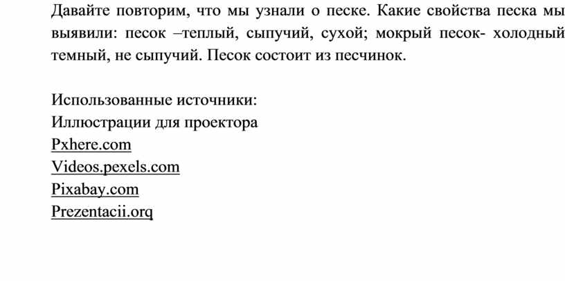 Давайте повторим, что мы узнали о песке. Какие свойства песка мы выявили: песок –теплый, сыпучий, сухой; мокрый песок- холодный темный, не сыпучий. Песок состоит из песчинок.