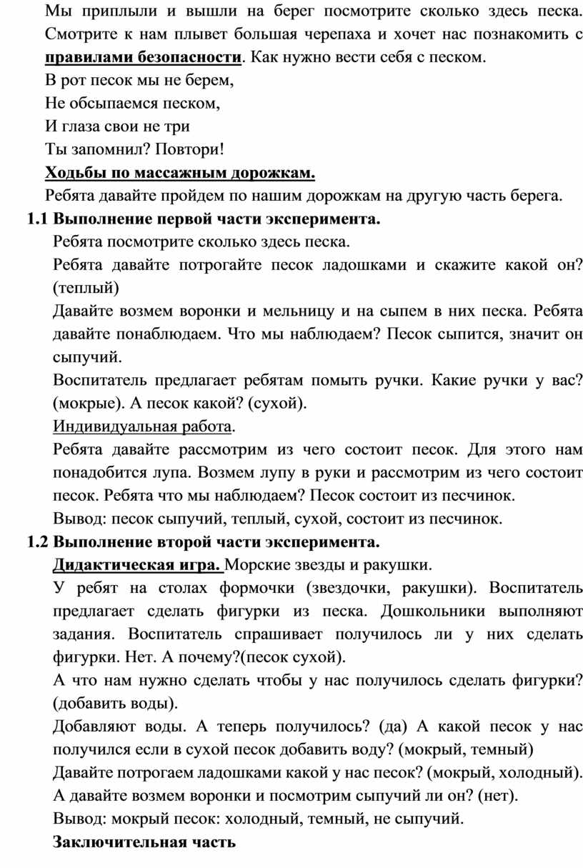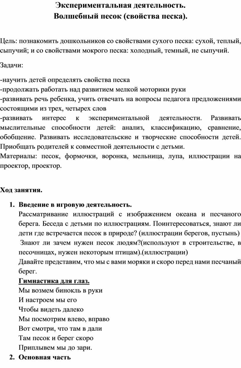 Цель: познакомить дошкольников со свойствами сухого песка: сухой, теплый, сыпучий; и со свойствами мокрого песка: холодный, темный, не сыпучий.